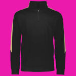 Heavyweight 100% polyester matte brushed tricot * Tag-free label * Quarter zip pullover style * Contrast color inserts * Set-in sleeves * Front pouch pockets * Self-fabric cuffs and bottom band