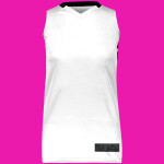 100% polyester wicking knit with color secure(r) technology that helps prevent dye migration * Wicks moisture * Ladies' fit * Updated tailored fit * Tag-free label * Outside locker label * V-neck collar * Racerback styling * Contrast color inserts * Designed to be NFHS compliant