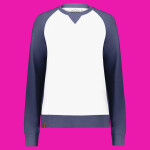 * 7.6 ounce 55% polyester/41% cotton/4% rayon, super soft fleece * Ladies' fit * Woven label * Exterior faux leather logo loop label * Contrast color V insert at center front neck * Raglan sleeves * Rib-knit collar, cuffs and bottom band