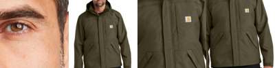 Our best-selling Shoreline Jacket has been updated. 7.3-ounce, 100% nylon oxford shell Storm Defender ® waterproof, breathable technology Wind Fighter ® technology tames wind 10K/10K waterproof/breathable protection rating Fully taped waterproof seams Polyester mesh lining Taffeta lining in sleeves and hood for easy on/off Adjustable, removable roll-away hood Full-zip front with inner and outer storm flaps Two interior pockets with hook and loop closures Left chest pocket with secure waterproof zipper and storm flap Two lower front pockets with zippered closures and storm flaps Adjustable cuffs with hook and loop closures and inner sleeve storm cuffs Adjustable drop tail hem Carhartt-strong, triple-stitched main seams Carhartt label sewn on chest pocket Loose fit