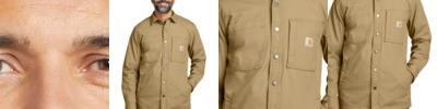 Stay warm while getting the range of motion you need in a shirt jac that's rugged enough for chores like chopping wood or repairing a broken fence post. 8.5-ounce, 98/2 cotton/spandex stretch canvas Printed fleece lining Rugged Flex ® technology for ease of movement Spread collar Metal snaps throughout Right chest pocket Left chest pocket with zipper closure Two large lower-front welt pockets Two snap-adjustable cuffs with extended plackets Carhartt label sewn on left chest pocket Relaxed fit