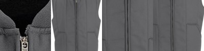 - Front zippered pockets with knotted zipper pulls and binding trim