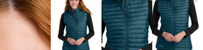 Designed with traditional quilt lines, this insulated vest is built for warmth and weather-resistant performance. Features include full-length interior storm flap with chin guard, exposed, molded zippers with Eddie Bauer logo pulls, zippered hand pockets and a slight drop tail hem. Includes a decoration access pocket. Packs into zippered left hand pocket. Contrast Eddie Bauer heat transfer logo on right hem. Made of 100% polyester ripstop and 3.8-ounce, 100% polyester blown fill. PU coating on back of shell. Durable water-repellent (DWR) finish.