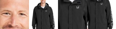 92/8 polyester/ spandex 2.5 layer waterproof body fabric fully seam sealed construction Zippered chest pocket Zippered hand pockets Bungee adjustments on hem and in hood
