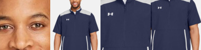 - UA woven label centered on left sleeve hem and UA heat seal center back neck