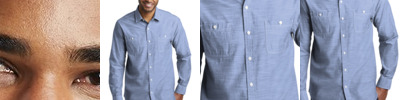 Washed chambray and off-white contrast stitching give this casual garment washed shirt an authentic, laid-back look. 3-ounce, 100% cotton slub chambray Open collar Back shoulder pleats Double chest pockets with buttons Rounded single-button cuffs