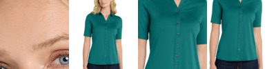 Performance joins professionalism in this Easy Care style that is snag-resistant and wicks moisture while also resisting odors. 5.6-ounce, 94/6 poly/spandex Snag-resistant Stretch Moisture-wicking Odor-resistant Easy Care Y-neck collar Tag-free label Full-button placket Pearlized smoke buttons Longer length short sleeves Slightly curved hem Drop tail hem